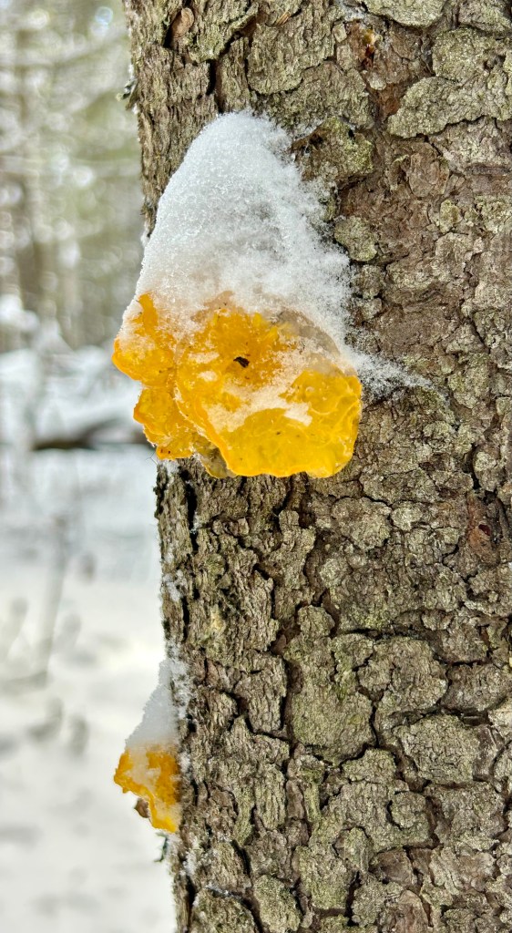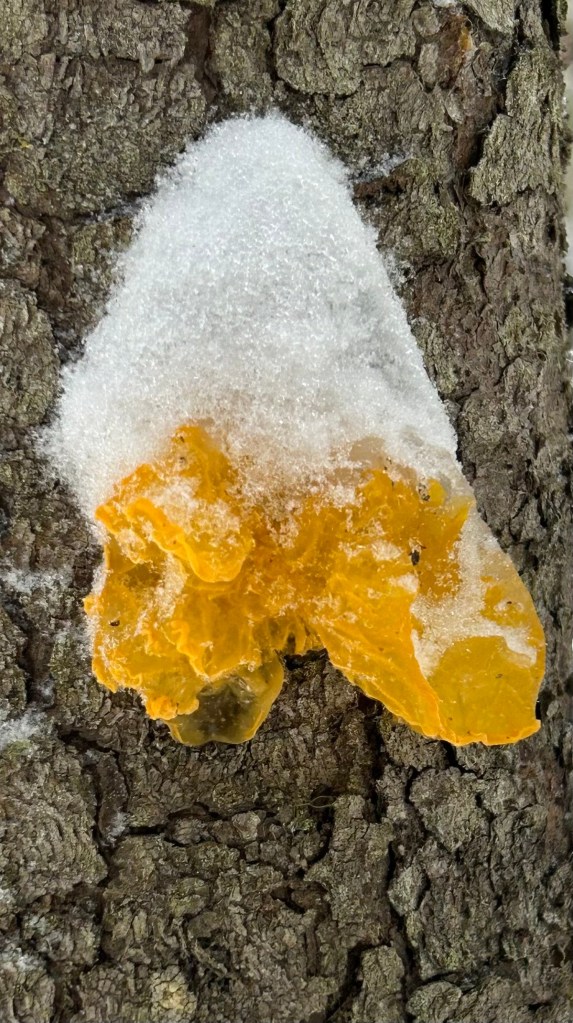 The scientific explanation is that witch’s butter has deep roots within the bark of a dead or dying tree, where it gets a continuous supply of nutrients from another fungus living within the bark. This reliable nutrient supply helps it survive cold winters. Normally, the outer part of the fungus would shrink and dry out during winter. It would then reanimate when snow turns to rain in the Spring. The particular fungus in my photo might have frozen solid before it had a chance to dry out. Alternatively, the tree it was rooted in was somehow keeping the fungus warmer than the outside freezing temperatures.